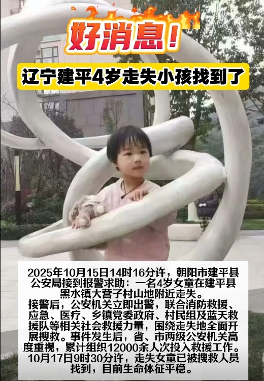 2025年10月15日14時(shí),當(dāng)“4歲女童走失”的警情從遼寧建平傳出,一場(chǎng)跨越地域與身份的愛心接力就此啟程,最終以“生命體征平穩(wěn)”的消息畫上圓滿句點(diǎn)。這不僅是一次搜救的成功,更是一幅“一方有難八方支援”的生動(dòng)畫卷。
